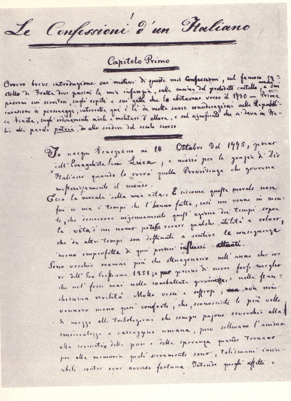 Existují romány, které vyprávějí příběh jednotlivce. A existují romány, v nichž se v jednom lidském životě odráží celé dějiny země. Zpověď Italova Ippolita Nieva patří k těm druhým. Je to kniha, která vznikla z neklidu mladého autora a z atmosféry epochy, v níž se Itálie teprve rodila jako politický i kulturní celek.